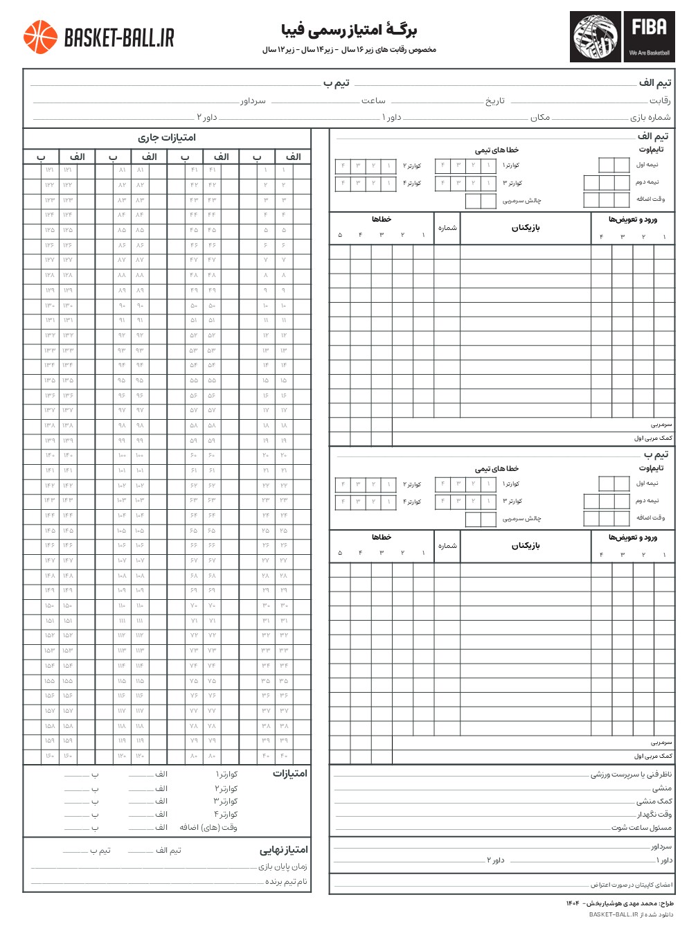 برگه امتیاز (اسکورشیت) پیش‌رو به‌طور تخصصی برای مسابقات بسکتبال رده‌های سنی پایه (نوجوانان زیر ۱۶ سال – نونهالان زیر ۱۴ سال – مینی‌بسکتبال زیر ۱۲ سال) طراحی شده است. مهم‌ترین ویژگی این برگه، وجود بخشی مجزا برای ثبت تعویض‌های اجباری است که طبق قوانین محلی برای این رده‌های سنی وضع شده است. این طراحی به داوران و منشی بازی این امکان را می‌دهد تا به راحتی و بدون اشتباه، تعویض‌های برنامه‌ریزی شده در کوارترهای مختلف را مدیریت و ثبت کنند. شما می‌توانید فایل PDF باکیفیت این برگه امتیاز را از طریق لینک زیر دانلود و برای استفاده در مسابقات خود پرینت بگیرید.